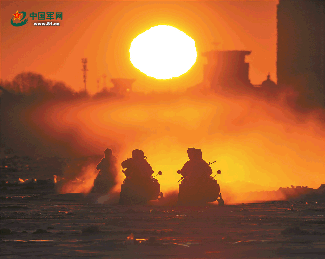 官兵們乘摩托雪橇在界江巡邏執(zhí)勤。
