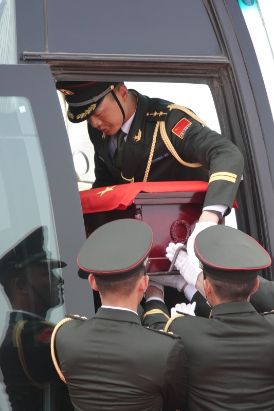 當(dāng)日,第五批在韓中國人民志愿軍烈士遺骸由我空軍專機(jī)護(hù)送從韓國接回遼寧沈陽,20位志愿軍烈士英靈回到祖國和人民懷抱。新華社記者 李剛 攝
