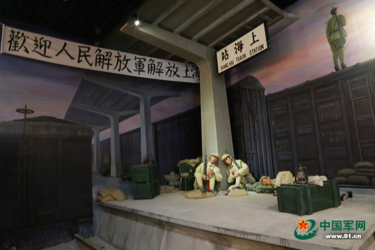 八連連史館中展示的八連官兵初入上海夜宿站臺(tái)時(shí)的場(chǎng)景。