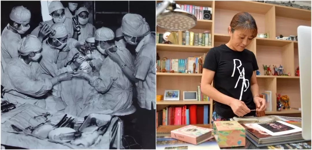 拼版照片:左圖為唐山大地震發(fā)生后,上海醫(yī)療隊(duì)在給傷員做手術(shù)(資料照片);右圖為2016年7月24日,“地震嬰兒”孫滬在家中整理老照片(新華社記者牟宇攝)。