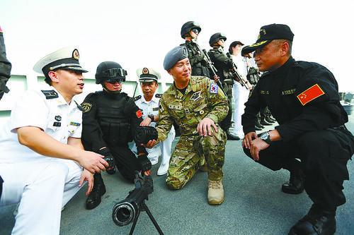 中國海軍護(hù)航編隊(duì)官兵向外軍介紹裝備。