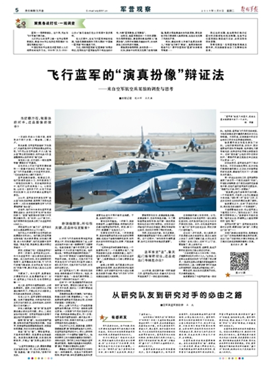 中國空軍的專業(yè)航空兵藍(lán)軍進(jìn)入人們視野的時間并不長。2015年“火力-2015·山丹A”演習(xí)是他們在公開報道中首次亮相。在人們眼中,這支飛行藍(lán)軍神秘而低調(diào),與威名赫赫馳騁朱日和大漠的“中國第一藍(lán)軍旅”相比截然不同。不過,與陸軍藍(lán)軍旅“紅藍(lán)兼?zhèn)洹钡睦砟钕嗨?,空軍的這個藍(lán)軍旅也有個響當(dāng)當(dāng)?shù)目谔?,叫做“藍(lán)軍最像,紅軍最強(qiáng)”。這背后,是藍(lán)軍建設(shè)的一個共同課題:作為假想敵部隊(duì),最首要的就是把敵人“演真扮像”,為和平時期練兵提供對手,對未來戰(zhàn)場上的對抗進(jìn)行推演。請關(guān)注今日《解放軍報》的報道——