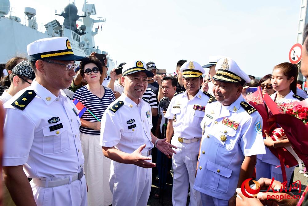 第30批護航編隊指揮員與柬海軍云壤基地副司令羅威斯納少將在碼頭交流。來永雷攝