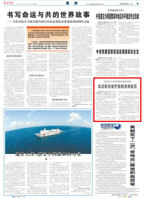 解放軍報(bào)亞丁灣1月19日電 特約記者薛成清、通訊員簡(jiǎn)日利報(bào)道:當(dāng)?shù)貢r(shí)間1月18日,繼千里疾馳救治我國(guó)漁船傷員后,海軍第31批護(hù)航編隊(duì)駱馬湖艦再伸援手,成功救治被護(hù)船舶“海瀾之春”號(hào)患病船員耿玉龍。