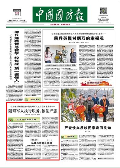 近日,山東省東阿縣人民法院公開宣判了一起阻礙軍人執(zhí)行職務(wù)案件,被告人王某因犯阻礙軍人執(zhí)行職務(wù)罪,被判處有期徒刑一年。該案引起媒體廣泛關(guān)注。請關(guān)注今日《解放軍報》的報道——