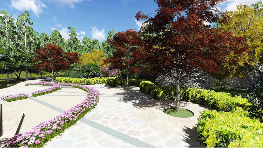 在植物種植搭配中,通過對(duì)不同的區(qū)域的不同定義進(jìn)行植物的分配種植,在空間結(jié)構(gòu)上結(jié)合道路、景觀小品、亮化設(shè)施等豐富展園層次。在種植過程中,結(jié)合喬木、灌木、地被植物相互穿插,進(jìn)行空間的搭配,營造不同的空間氛圍。