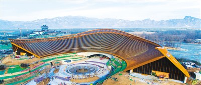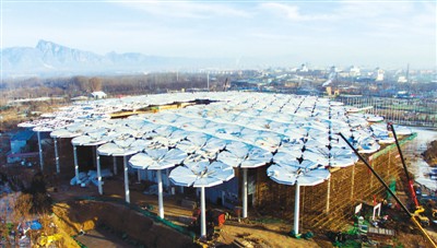 在北京世園會園區(qū)內(nèi),正在建設(shè)中的世園會標(biāo)志性建筑——中國館,宛如一柄如意安置于一片寧靜之中。效仿先人“巢居”“穴居”的古老智慧,中國館是一座會呼吸、有生命的建筑,綜合利用雨水收集、生態(tài)滴灌等技術(shù),實(shí)現(xiàn)能源循環(huán)再生。由94把“花傘”簇?fù)矶傻膰H館,如同一片花海飄落在園區(qū)。設(shè)計(jì)師有意識地淡化了建筑形象,使建筑與自然和諧共融。整個(gè)展館利用建筑遮陽、自然通風(fēng)、太陽能光伏發(fā)電、蒸發(fā)冷卻降溫、滴灌和雨水回收利用等可持續(xù)技術(shù),變得綠色、環(huán)保、低能耗。植物館則以植物根系為靈感,龐大的垂墜根系向下不斷蔓延,將植物原本隱藏于地下的強(qiáng)大生命力直觀呈現(xiàn)給參觀者。