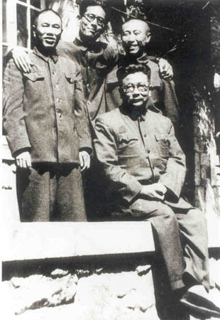 朝中方面代表團(tuán)中國人民志愿軍代表鄧華(左)、解方(右)和協(xié)助志愿軍代表進(jìn)行談判工作的李克農(nóng)(前)、喬冠華(后中)。