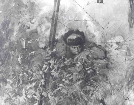 志愿軍第15軍在鐵原東北391高地的反擊作戰(zhàn)中,第29師87團(tuán)戰(zhàn)士邱少云為堅(jiān)守戰(zhàn)場(chǎng)潛伏紀(jì)律,寧可被烈火燒死,也決不暴露目標(biāo)。(美術(shù)作品)