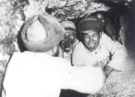 1952年5月底,志愿軍第一防御地帶的坑道工事基本完成。它與各種野戰(zhàn)工事相匹配。圖為戰(zhàn)士們打通坑道勝利"會師"。