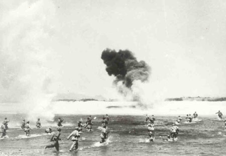 志愿軍攻克漢城后,冒著炮火渡過漢江。