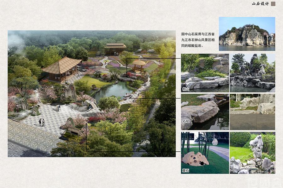 在第一境之幻境,以陶淵明醉酒雕像為形象點題,構景“陶公醉酒”,以酒為水巧妙構成全園水景的源頭。同時,瓷畫山屏組合以唐寅《廬山圖》為畫境,以山型瓷板畫為載體,周圍遍植桃花,點綴江西杜鵑樁景、呈現(xiàn)世外桃源的夢幻畫境;穿過溪山桃林,豁然開朗,以琴湖水澗與假山竹亭構成休閑空間,這里就是第二境之雅境,其中的桃林、巖石花境等營造琴湖問津、花徑覓春的意境;經(jīng)過假山,由多種菊花、竹籬笆、竹舍形成的菊圃景觀,再現(xiàn)采菊東籬下、悠然見南山的“野境”,竹舍中布置瓷畫、瓷器等展示陶淵明的田園詩句與歸隱生活,營造“竹舍歸隱”;菊圃回轉、書琴湖畔,置一敞軒于幽蘭庭前,作為隱者閑適縱歌、詩酒人生的場地,營造蘭庭唱晚的“樂境”,讓游客悠然忘歸。