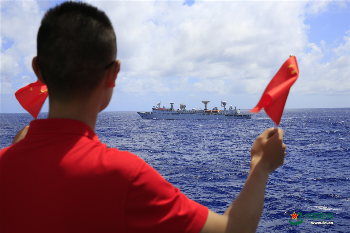 隔著海,船員們揮動(dòng)國(guó)旗互相致敬。王煦之 攝