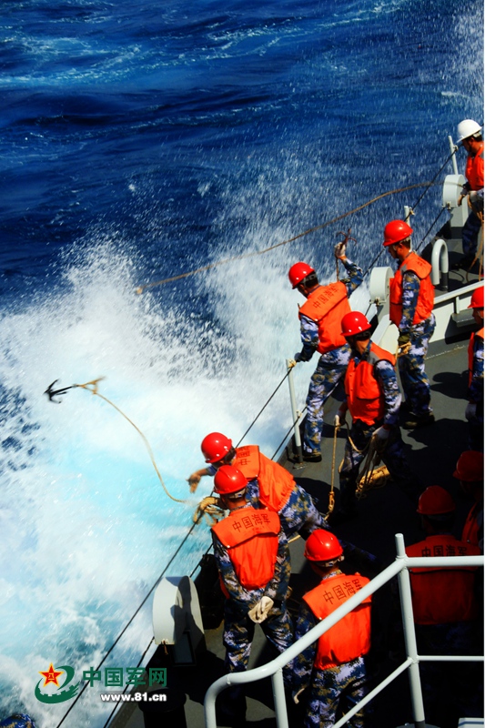 官兵們?cè)诤I线M(jìn)行救生訓(xùn)練,艦艇向遇險(xiǎn)人員處航行,擊起朵朵浪花。官兵打撈遇險(xiǎn)人員的動(dòng)勢(shì)與浪花,構(gòu)成一幅大浪淘沙景色。