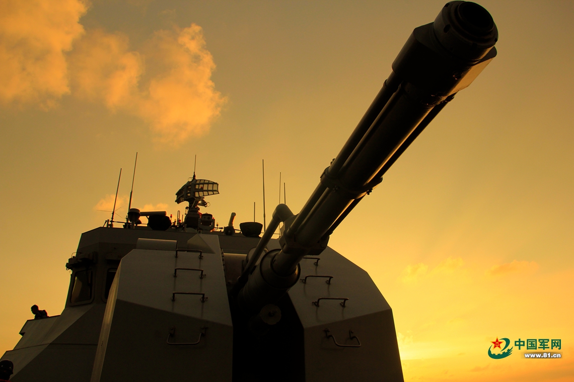 這張圖是夕陽(yáng)下,艦炮仰天的圖景,黃色的天空為背景,襯托出艦炮的威武氣概。