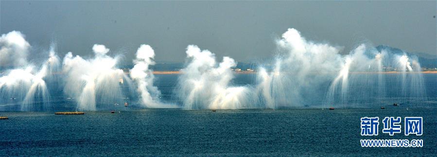 2016年9月18日,中俄“海上聯(lián)合-2016”演習舉行立體奪控島礁演練。這是掩護陸戰(zhàn)隊員沖灘的煙幕彈在空中炸開(資料照片)。新華社發(fā)(孫宏韜 攝)