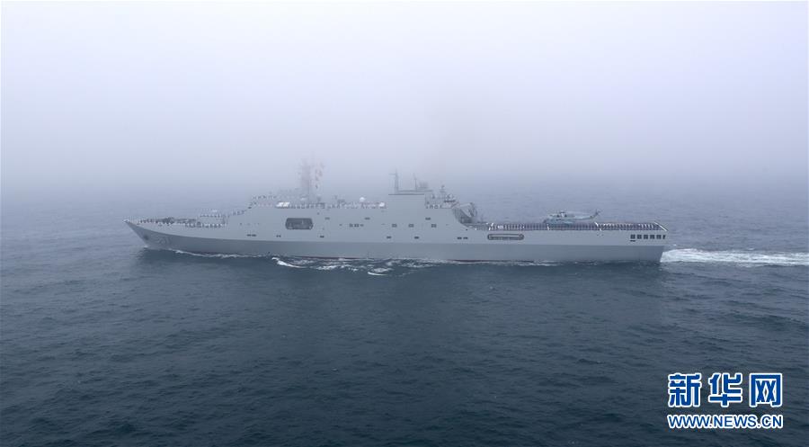 4月23日,慶祝中國人民解放軍海軍成立70周年海上閱兵活動(dòng)在青島附近??沼蚺e行。這是“沂蒙山”號(hào)登陸艦。 新華社記者 琚振華 攝