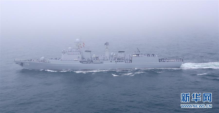 4月23日,慶祝中國人民解放軍海軍成立70周年海上閱兵活動在青島附近??沼蚺e行。這是“石家莊”號導(dǎo)彈驅(qū)逐艦。 新華社記者 琚振華 攝