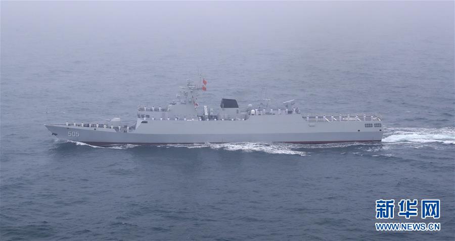 4月23日,慶祝中國人民解放軍海軍成立70周年海上閱兵活動在青島附近??沼蚺e行。這是“張掖”號導彈護衛(wèi)艦。 新華社發(fā)(尚文斌 攝)