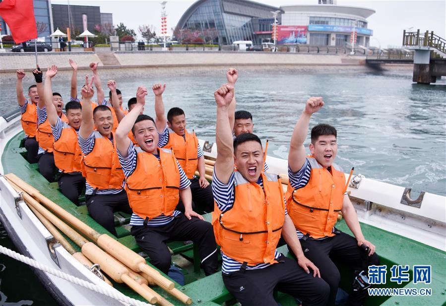 4月24日,中國海軍代表隊在獲勝后慶祝。當(dāng)日,中國人民解放軍海軍成立70周年多國海軍活動舢板比賽在青島奧林匹克帆船中心舉行,8支來自各國的參賽隊伍展開角逐,最終中國海軍代表隊獲得冠軍。新華社記者 李紫恒 攝