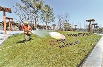 園林工人正在世園會1號大門外廣場為草坪澆水 攝影/本報(bào)記者 林輝