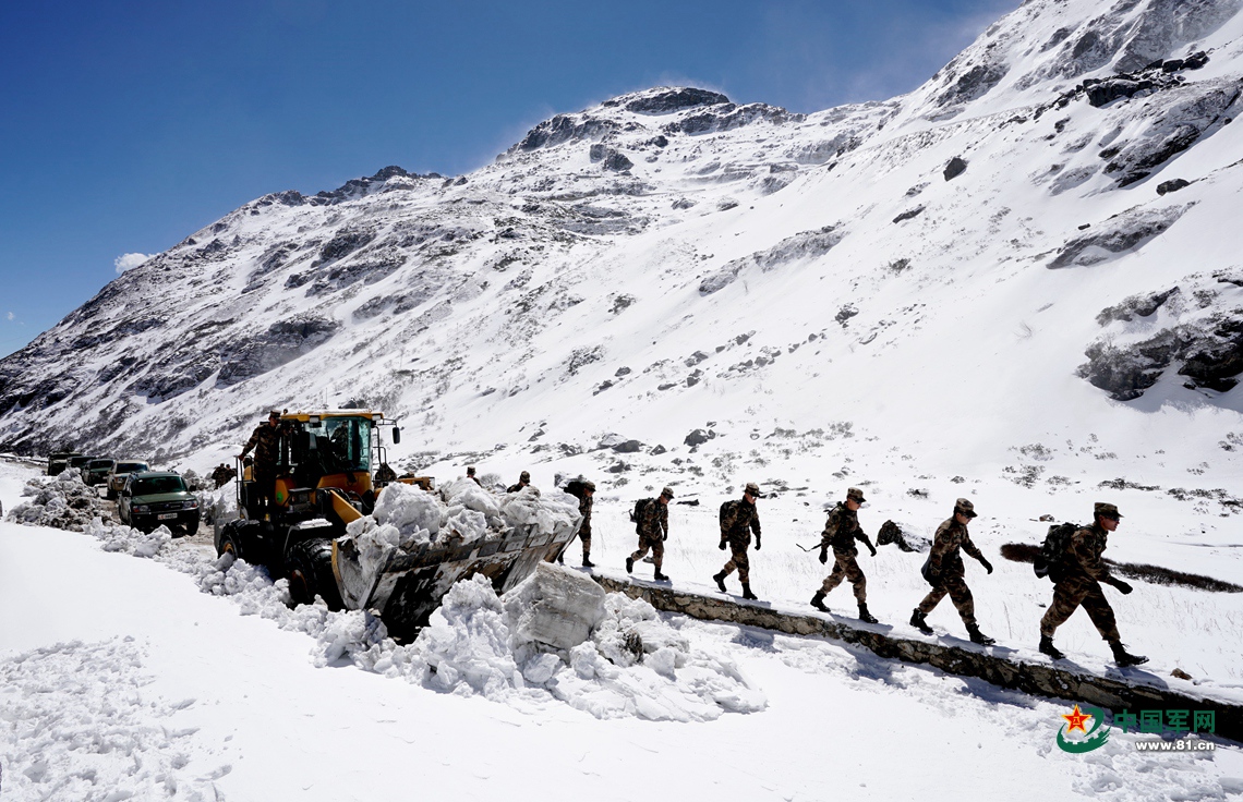 在多仁邊防連防區(qū)厚達(dá)2米的積雪面前,推土機(jī)也無能為力,官兵只能改為徒步執(zhí)行巡邏任務(wù)。中國(guó)軍網(wǎng)記者柳軍 攝