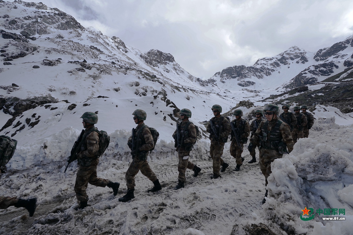 多仁邊防連官兵在指導(dǎo)員陳龍的帶領(lǐng)下,克服高原反應(yīng),踏著較深的積雪,堅持五小時順利完成了當(dāng)日的巡邏任務(wù)。中國軍網(wǎng)記者柳軍 攝