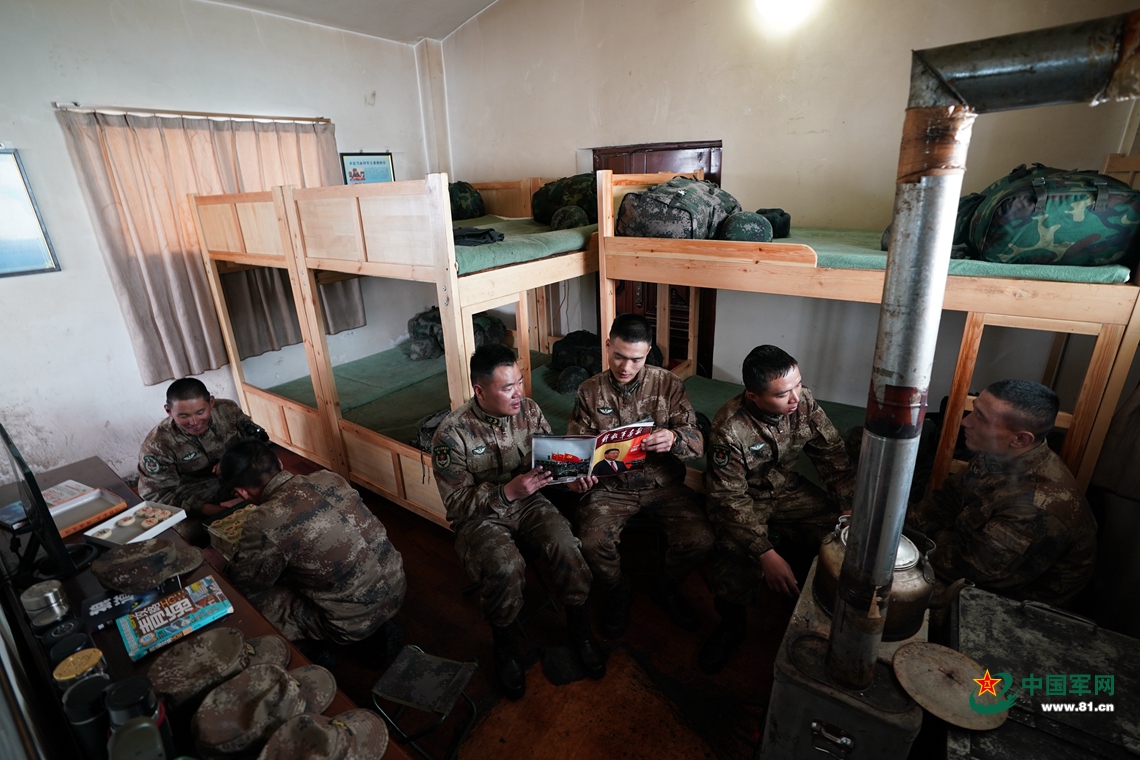 晚飯后,四級軍士長楊東儒(左三)與戰(zhàn)友們各得其樂,整個哨樓彌漫著書香棋韻。中國軍網(wǎng)記者柳軍 攝