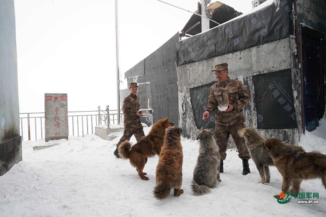 “開飯啦!”伴著哨聲和口令,卓拉哨所的無言戰(zhàn)友瞬間聚集,圍著四級軍士長楊東儒做親昵狀。中國軍網(wǎng)記者柳軍 攝