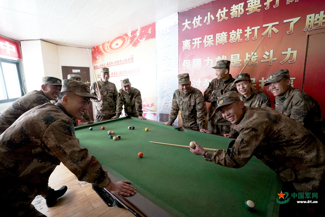 卓拉哨所藏龍臥虎,上等兵梁雅運(右一)號稱“桌球王子”。瞧,他與下士朋毛冷知的巔峰對決,引得全哨戰(zhàn)友圍觀。中國軍網(wǎng)記者柳軍 攝