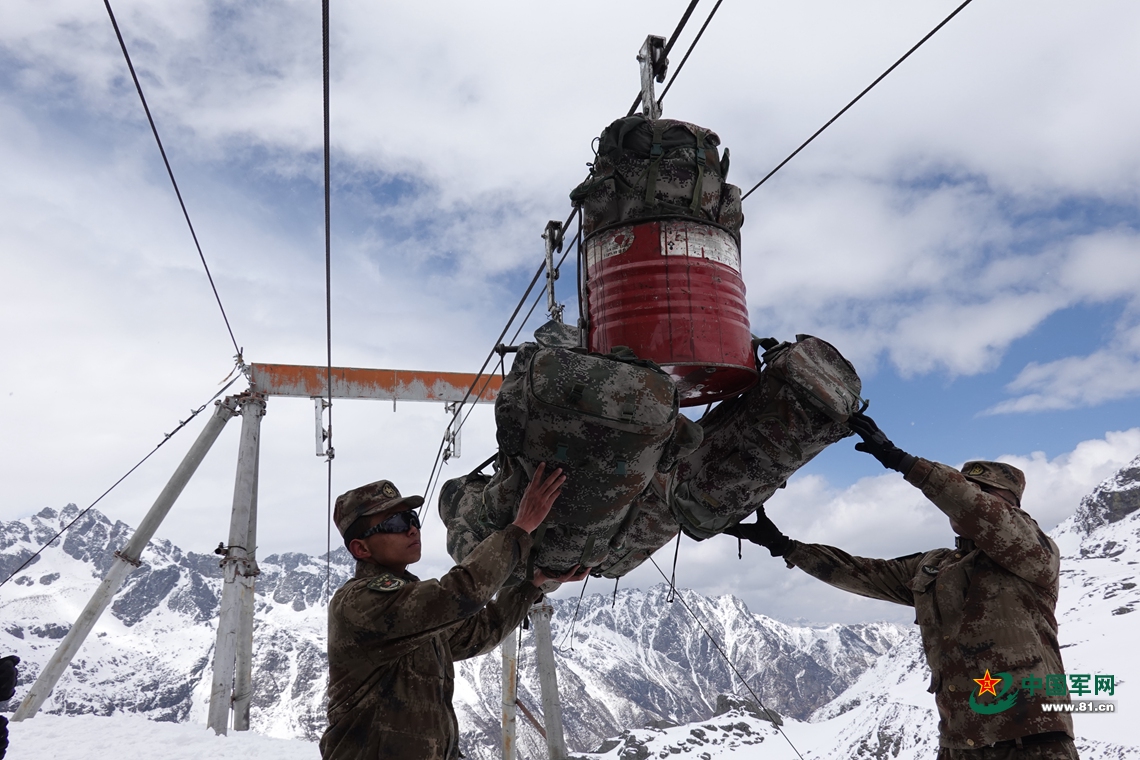 說來也巧,記者一行到達離卓拉哨所最近的平臺時,通過索道運送的物資也從天而至,等候在此的哨兵們滿載而歸。中國軍網(wǎng)記者柳軍 攝