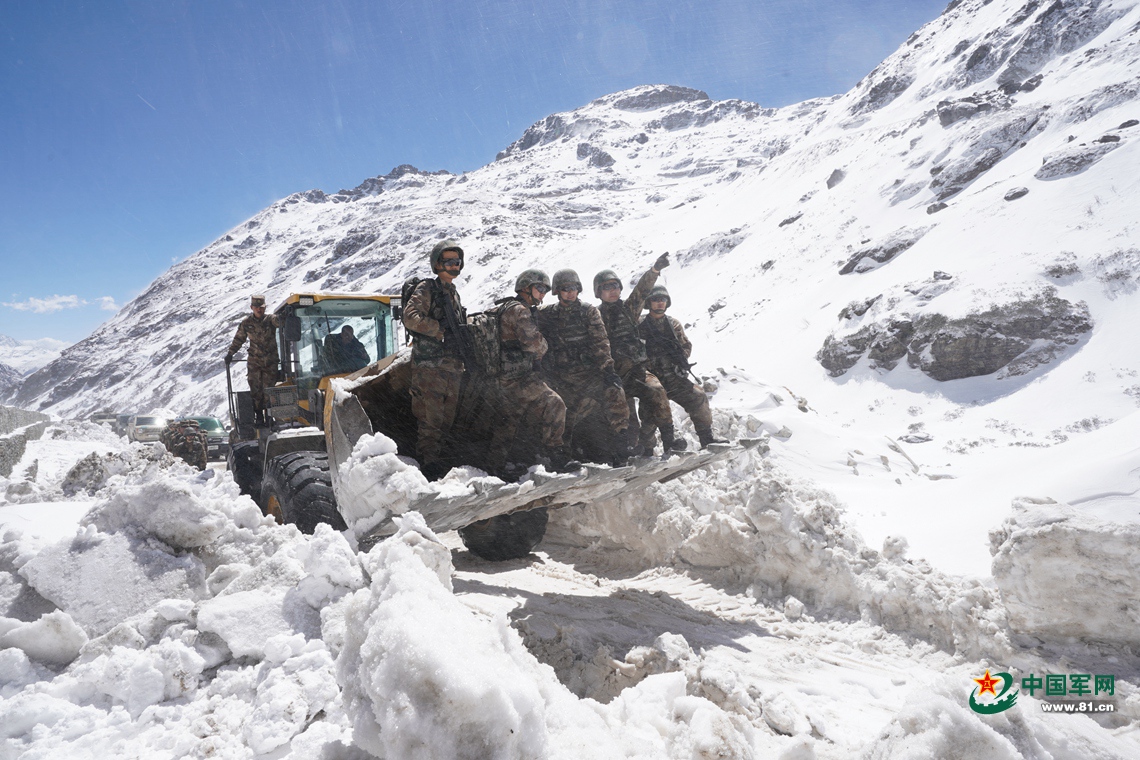 4月19日,記者跟隨邊防連官兵前往卓拉哨所途中又遭遇暴風(fēng)雪,借助大型鏟雪車前行一公里后,道路被兩米高、近50米長的雪墻阻斷,人車均無法前行。中國軍網(wǎng)記者柳軍 攝