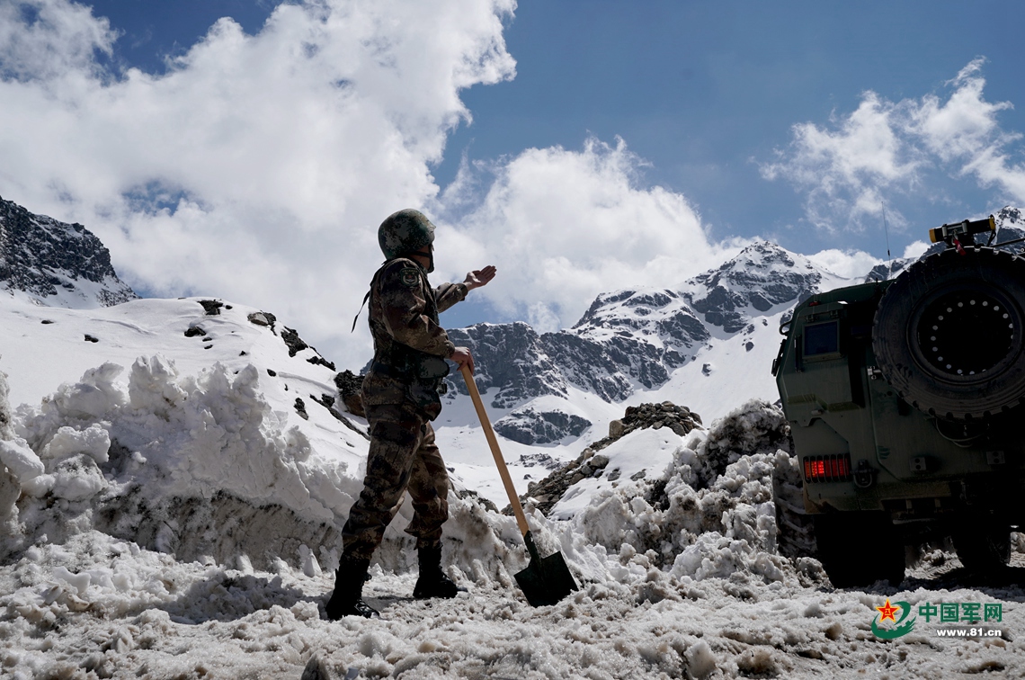 巡邏分隊在推土機(jī)開路的同時配合人工挖雪,以確保當(dāng)日執(zhí)勤任務(wù)的順利完成。中國軍網(wǎng)記者柳軍 攝
