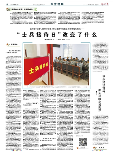 如今,該旅“士兵接待日”已運行了一年多,全旅上上下下正悄悄發(fā)生變化:機關(guān)作風(fēng)更實、辦事效率更高,連隊裝上了熱水器、建起了健身室,官兵練兵備戰(zhàn)熱情更高……