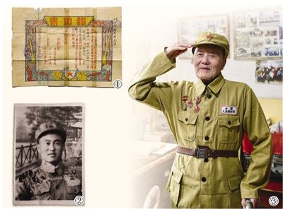 圖①:張富清當年的報功書翻拍。圖②:張富清年輕時的照片翻拍。新華社記者 程 敏攝圖③:張富清近照。本報記者 田豆豆攝