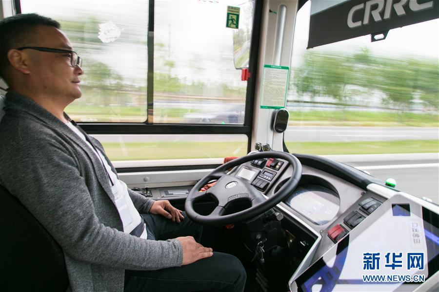 一輛無(wú)人駕駛公交車在國(guó)家智能網(wǎng)聯(lián)汽車(長(zhǎng)沙)測(cè)試區(qū)內(nèi)行駛,駕駛座位的測(cè)試員關(guān)注路況和駕駛數(shù)據(jù)(4月28日攝)。 新華社發(fā)(陳思汗攝)