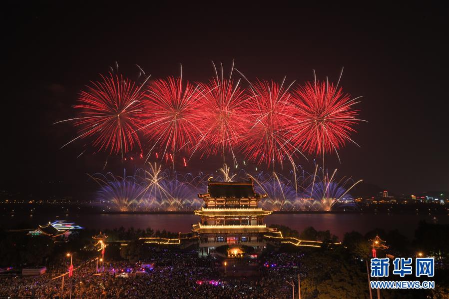 湖南長(zhǎng)沙橘子洲的焰火與長(zhǎng)沙城區(qū)的杜甫江閣交相輝映(5月1日攝)。 新華社發(fā)(陳澤國(guó)攝)