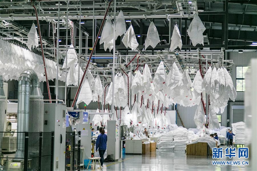 4月28日在湖南長(zhǎng)沙拍攝的夢(mèng)潔家紡智能生產(chǎn)線。 新華社發(fā)(陳思汗攝)