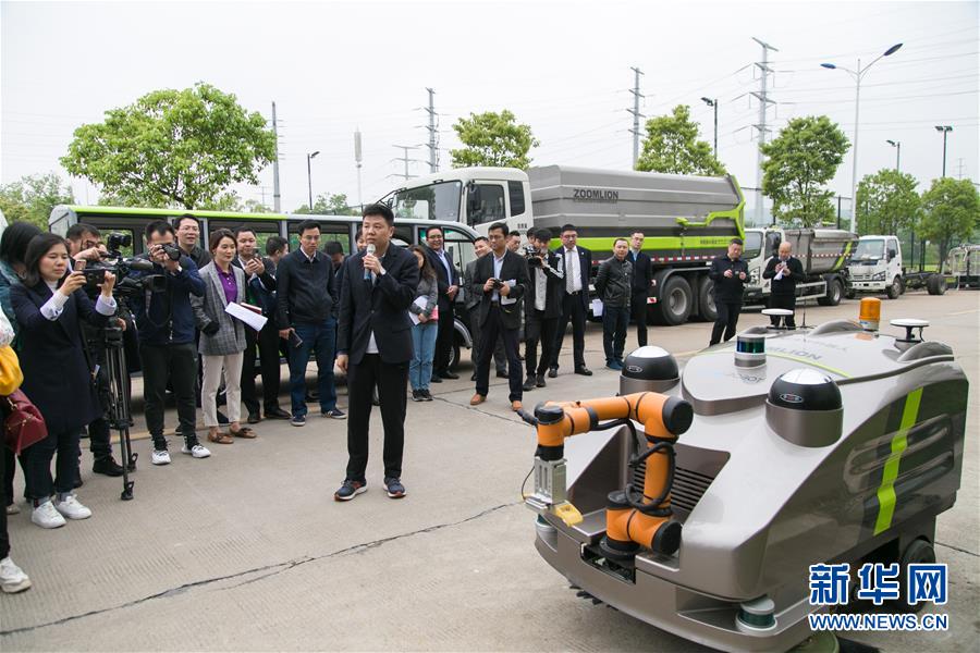 長(zhǎng)沙中聯(lián)重科環(huán)境產(chǎn)業(yè)有限公司的工作人員展示一款智能清撿保潔機(jī)器人(4月28日攝)。新華社發(fā)(陳思汗攝)