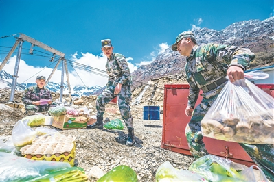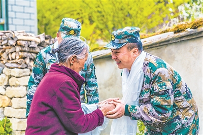 圖③:官兵看望曾為哨所背菜長達10年的藏族老阿媽。索道建成后,她光榮“退休”。
