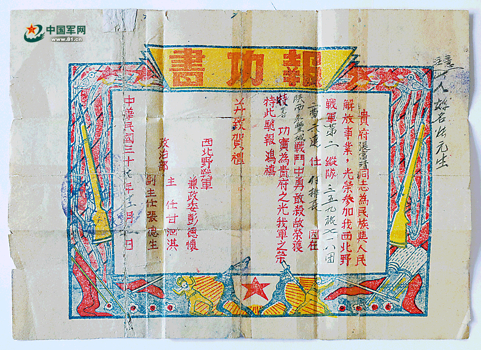 解放戰(zhàn)爭時期,張富清立功獲得的“報功書”。