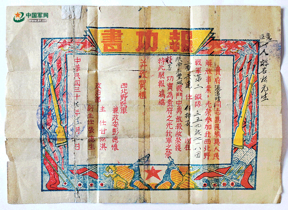解放戰(zhàn)爭時期,張富清立功時的報功書。中國國防報記者 穆可雙攝
