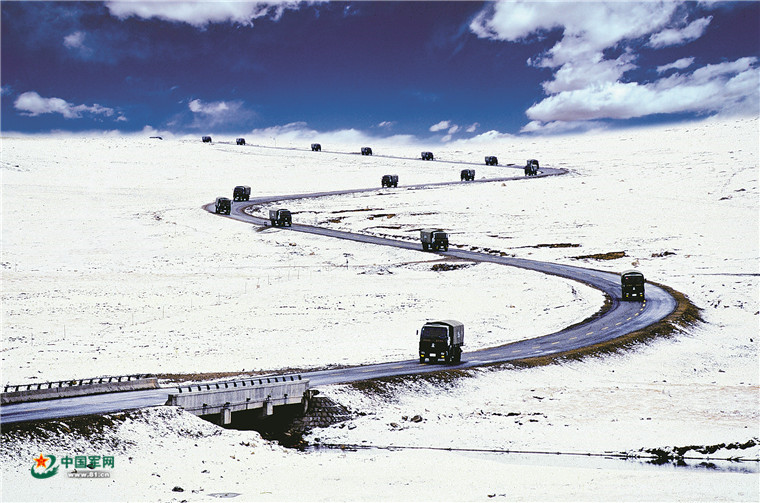 青藏兵站部運輸車隊馳騁在風雪青藏線上。鄒小慶攝