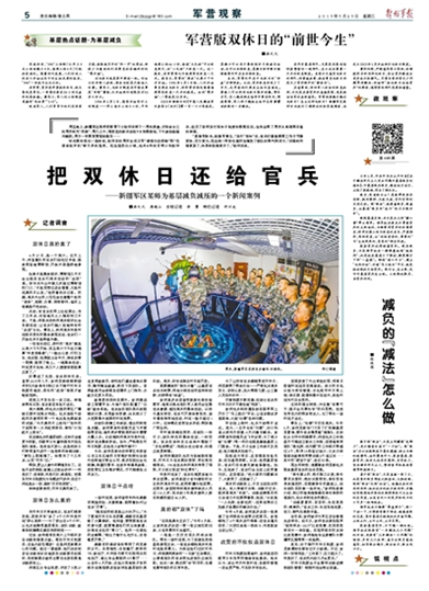 應(yīng)該看到,保證軍人合法的休息權(quán)利,不僅是關(guān)愛(ài)官兵的直接表現(xiàn),更是依法治軍的具體落實(shí)。軍營(yíng)到底能不能過(guò)雙休日?怎么過(guò)好雙休日?新疆軍區(qū)某師對(duì)此進(jìn)行了調(diào)研論證和實(shí)踐摸索,決定從2018年5月開(kāi)始施行雙休日制度。