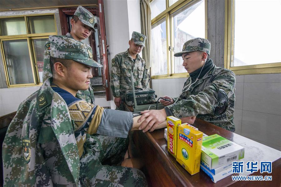 西藏軍區(qū)邊防某團軍醫(yī)張宏(右)到海拔4687米的卓拉哨所為官兵檢查身體(2016年5月8日攝)。 新華社發(fā)(羅凱 攝)