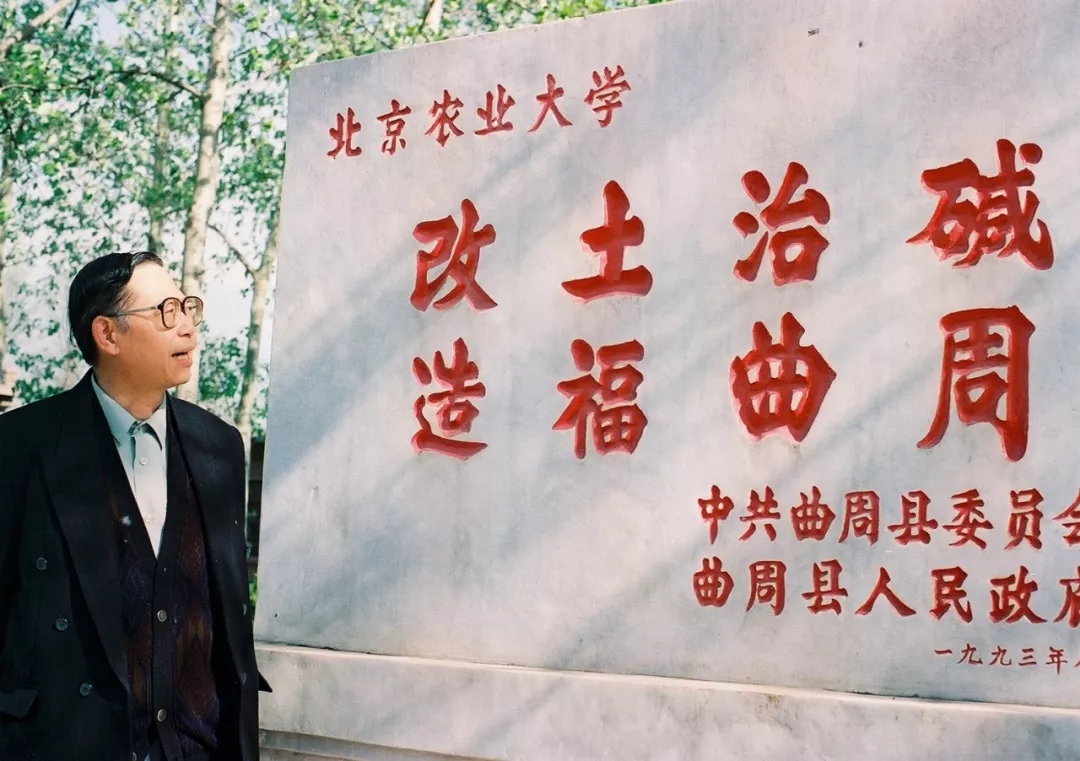 ↑1999年辛德惠院士在曲周實(shí)驗(yàn)站內(nèi)的改土治堿石碑前。
