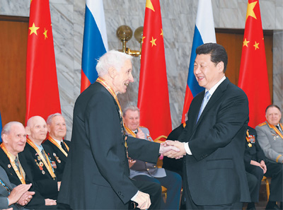 2015年5月8日,習(xí)近平在莫斯科會(huì)見曾在中國(guó)東北抗日戰(zhàn)場(chǎng)上和衛(wèi)國(guó)戰(zhàn)爭(zhēng)中浴血奮戰(zhàn)的18名俄羅斯老戰(zhàn)士代表。習(xí)近平同老戰(zhàn)士代表們一一握手,向他們致以親切問候,并頒發(fā)了紀(jì)念獎(jiǎng)?wù)?。?dāng)年邁的老戰(zhàn)士加維爾托夫斯基起身接受獎(jiǎng)?wù)聲r(shí),習(xí)近平看到他年事已高,腿腳不便,馬上說:“我過去給你頒獎(jiǎng),你別過來了?!绷?xí)近平快步走到老人身邊,為他佩戴上了紀(jì)念獎(jiǎng)?wù)?。全?chǎng)對(duì)此報(bào)以熱烈的掌聲。