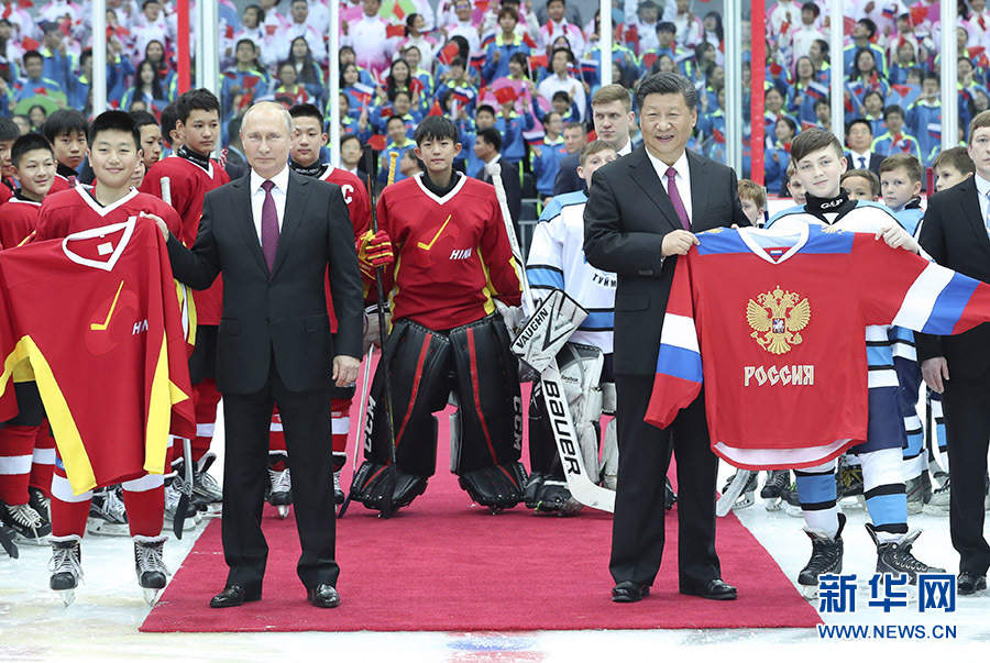 2018年6月,俄羅斯總統(tǒng)普京新任期首訪來到中國。兩位領導人在天津觀看中俄青少年冰球友誼賽,共同執(zhí)冰球落向冰面,為比賽開球。他對普京說,“兩國青少年要加強交流,使中俄睦鄰友好世代相傳?!逼站┗貞?,希望這樣的青少年冰球運動能成為俄中兩國友誼的新紐帶。