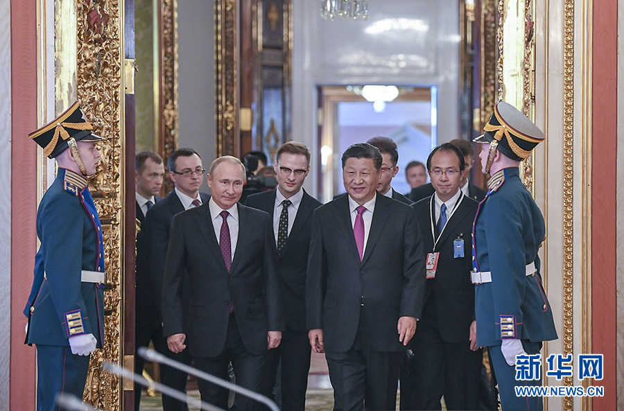 6月5日,國家主席習近平在莫斯科克里姆林宮同俄羅斯總統(tǒng)普京會談。這是兩國元首步入會場。 新華社記者 謝環(huán)馳 攝