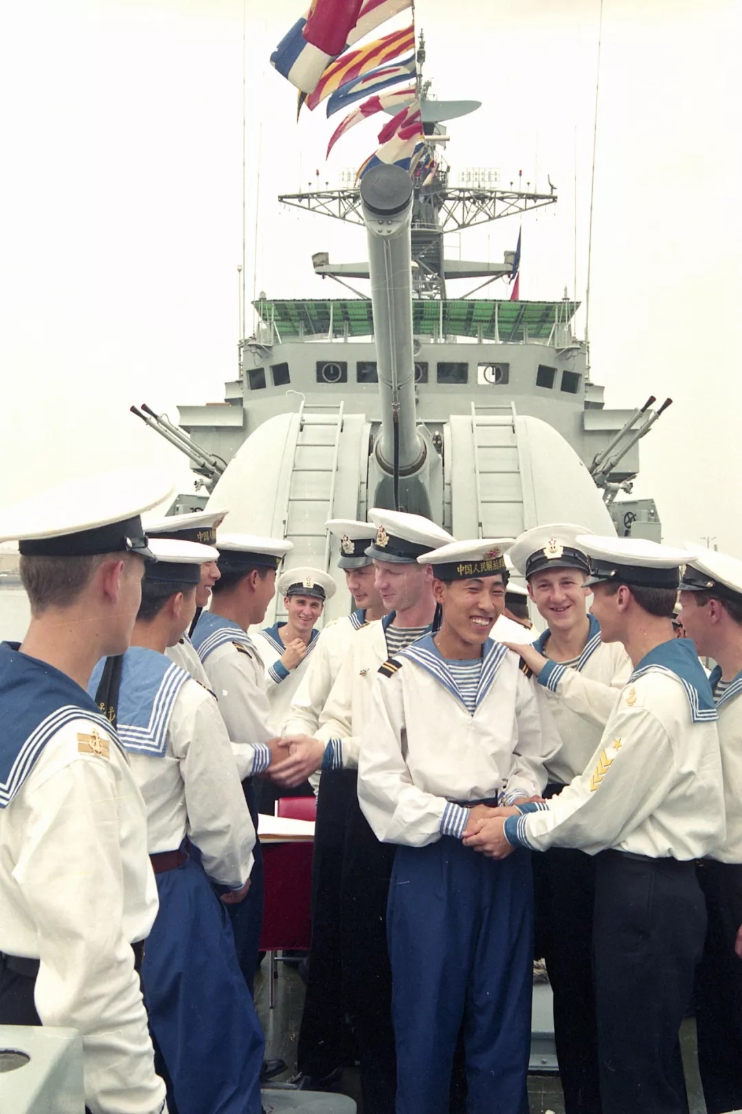 正在山東青島進(jìn)行友好訪問(wèn)的俄羅斯海軍太平洋艦隊(duì)官兵,來(lái)到中國(guó)海軍艦艇參觀,受到中國(guó)水兵的熱情歡迎。(1993年8月26日,新華社稿)